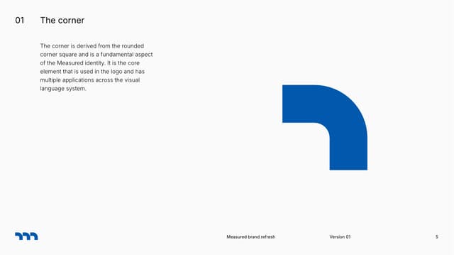 The corner is the foundation of the Measured identity and visual language. It is the core component used in the logo and has multiple applications across the visual language system.